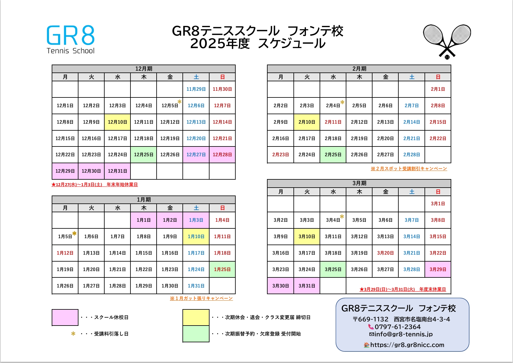 スクールカレンダー📅12月期~3月期 2025年11月6日 2025年11月12日 スクール生の皆様 2025年度 12月期~3月期のスクールカレンダーです。休校日等ご確認ください😊 フロントでも随時お配りしております。 ご不明な点はお気軽にフロントまでお問い合わせください。 2025.12-3月期スケジュール(名塩) 👈ダウンロード
