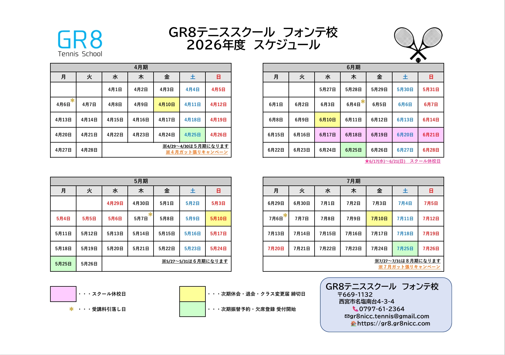 スクールカレンダー📅2026.4月期~7月期 2026年3月1日 2026年3月1日 スクール生の皆様 2026年度 4月期~7月期のスクールカレンダーです。休校日等ご確認ください😊 フロントでも随時お配りしております。 ご不明な点はお気軽にフロントまでお問い合わせください。 2026.スケジュール名塩(4-7月) 👈ダウンロード
